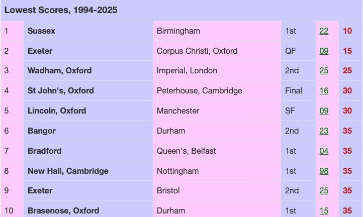 I had Sheffield ranked 10th and Strathclyde ranked 15th. Sheffield lost their first round match, but made it through the repechage comfortably, while Strathclyde faced the lowest-scoring opposition in round 1.