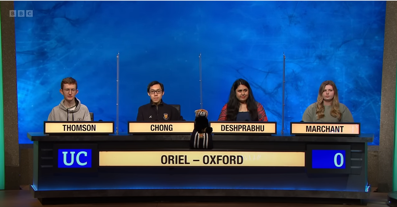 The first starter of the match goes to Chong, who wins the buzzer race to mole. Bonuses on the British Tree of the Year follow, and Oriel take one. This is an entirely real competition by the way, despite the fact that some of the entrant trees have names like 'The Oak at the Gate of the Dead', and 'The Ding Dong Tree'. You have to give props to Scotland's Tree of the Year in 2017, 'The Big Tree', of Kirkwall, which displayed a serious lack of pretension.