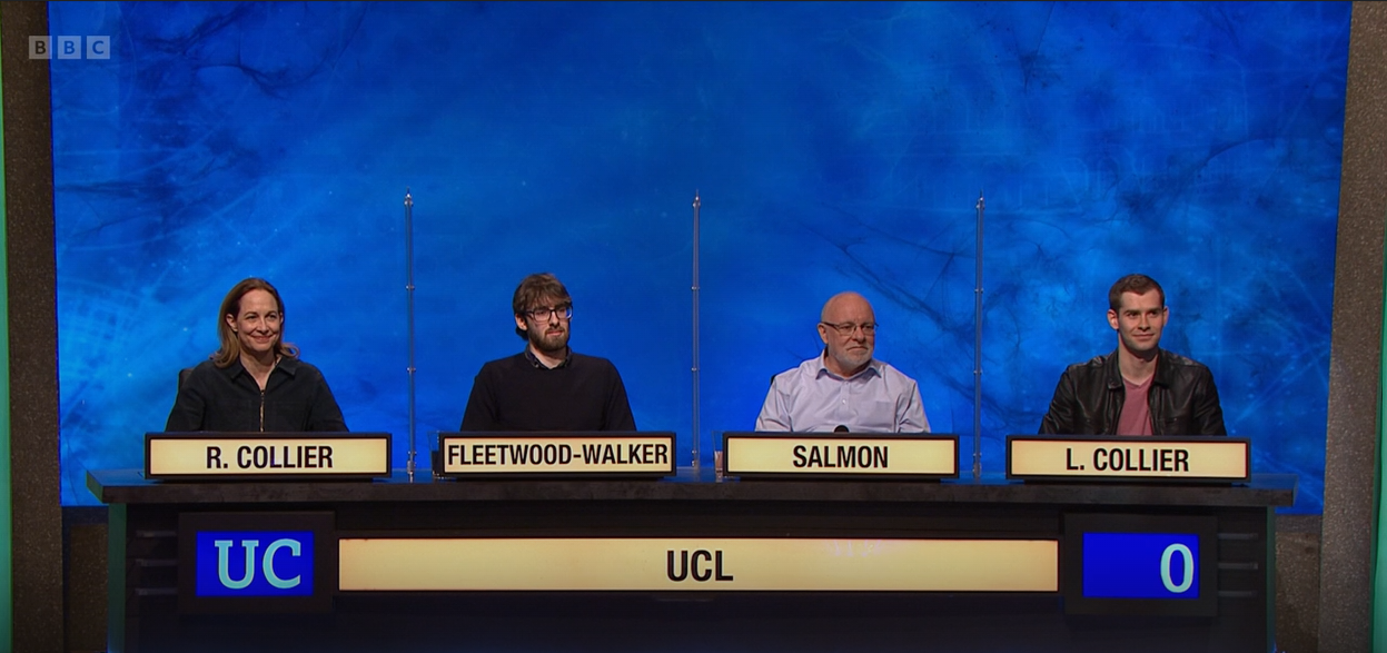 The first starter goes to UCL, who feature the mother-son duo of R and L. Collier. They take two bonuses, and then Salmon catches the second starter to extend their lead. An incorrect guess of 1720s from Newcastle allowed L. Collier to pick up another starter for the Londoners with 1730s. Its always a bit unfortunate when a team is one decade out in a 'which decade did all of the following events happen' question, but Newcastle couldn't allow self-pity to take hold - after the picture round, which went to Fleetwood-Walker, UCL were ninety points clear. Four of four on the buzzer. Ten of twelve on the bonuses.