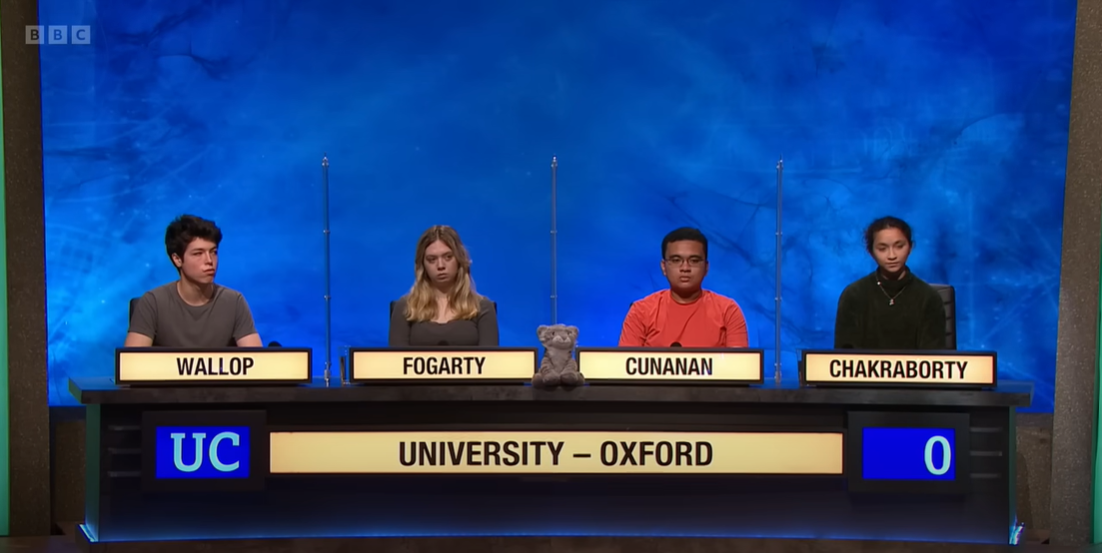 Paxman says that Univ never really got a chance to get going, to which Chakraborty quips, 'Yes, that was definitely our downfall'. At least they're taking their defeat in good humour. Jesus, meanwhile, will have to improve on the bonuses if they are to stand a chance in the quarter finals, but a decent performance nonetheless.