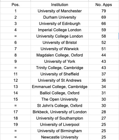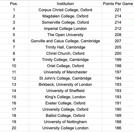 Unsurprisingly, Manchester top this list, with Imperial and Edinburgh switching places in 3rd and 4th. Magdalen rise from 8th to 6th, but there aren't many big changes. St John's, Cam (who make this list along with St John's, Ox) have scored exactly the same number of points as St Andrews and Birkbeck.