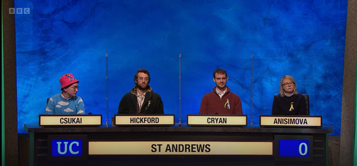 Hickford won the picture bonuses for St Andrews, and a single correct answer of Galilean brought them within five points. Csukai and his magic hat take the next starter, and with it the lead. Another from Hickford, which he celebrates with an ecstatic fist pump, gave them a bit of a gap.