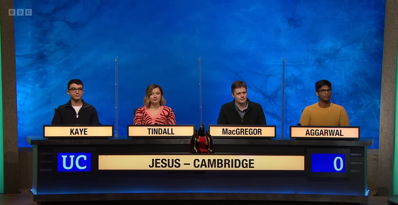 Until last week we hadn't had an Oxbridge clash all series, but with Jesus, Cam vs St Catherine's, Ox following on from Christ's vs Oriel we've now had two in a row. Both of tonight's Colleges have sisters with the same name at the other institution (although the St Caths at Cambridge is spelled with an A. Or rather, two As). Jesus have three quarter finals to their name, while its a first showing for Catz since a first round exit in 1998.